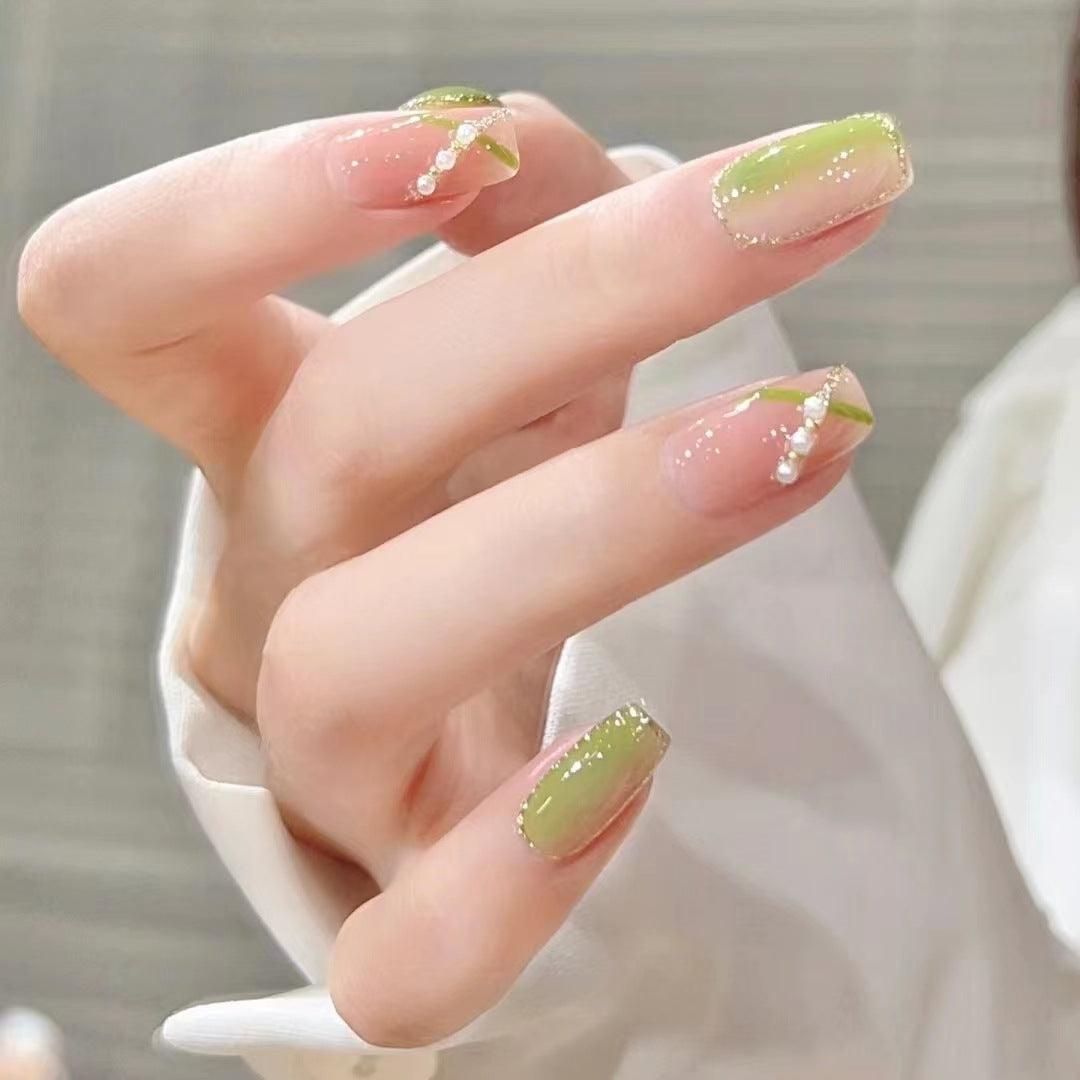 Green Cross Line Glittering Ombre Medium Length Press On Nails